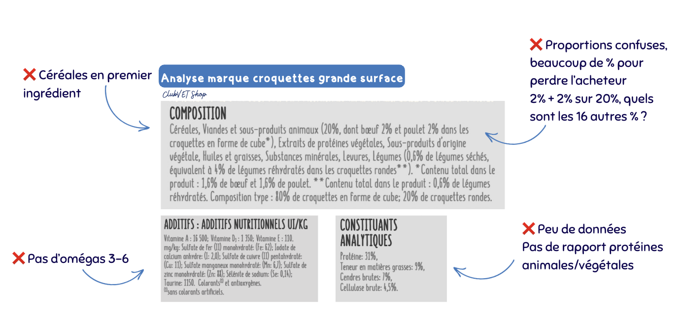- Les Croquettes de supermarché sont trop souvent associées à des pathologies liées à la nutrition et ne sont pas recommandées.